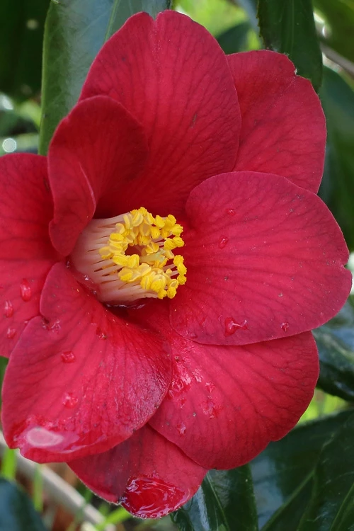 Discovered in 1968 and eventually introduced by Dr. Clifford Parks in Chapel Hill, NC, ‘Adeyaka’ can be loosely translated to “fascinating” or “beautiful,” and this outstanding beauty certainly lives up to her name. A true garden jewel, Adeyaka Camellia is adored for her abundant single flowers with dark-veined currant red petals surrounding a prominent cylinder of yellow anthers with pink filaments. The eye-catching flowers are produced from late winter into early spring against a background of lustrous dark green foliage. The flowers are perfect for cutting and displaying in your favorite vase. A vigorous grower to around 10 feet tall and 6 or so feet wide, Adeyaka can be grown as a shrub or lower branches can be removed to form a highly attractive small tree. Flexible branches lend well for attaching to walls for espalier (trained to grow flat against a wall).